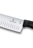 Il coltello Santoku ha la forma tipica del coltello usato nella cucina orientale con punta rivolta verso il basso e con lama molto alta che conferisce un’ottima sensazione di taglio.